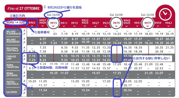 イタロ時刻表の読み方です。